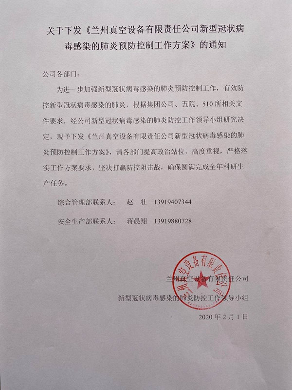 接到新型冠狀病毒感染的肺炎疫情防控工作要求的第一時間,他們便趕到公司,制定下發(fā)了公司《關于進一步加強新型冠狀病毒感染的肺炎預防控制工作的緊急通知》,成立了公司“新型冠狀病毒感染的肺炎防控工作領導小組”,擔負起了防控小組的主要日常工作,為保障假日期間信息渠道通暢,兩個人的手機24小時保持開機暢通狀態(tài),隨時處理各方面的信息,除了認真收集、匯總信息外,兩位同志還在2月1日制定下發(fā)了《蘭州真空新型冠狀病毒感染的肺炎預防控制工作方案》,為公司疫情防控工作提供了制度保障。